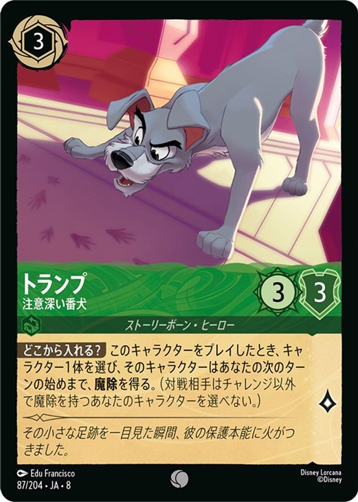 - 【どこから入れる?】 このキャラクターをプレイしたとき、キャラクター1体を選び、そのキャラクターはあなたの次のターンの始めまで、魔除を得る。(対戦相手はチャレンジ以外で魔除を持つあなたのキャラクターを選べない。)