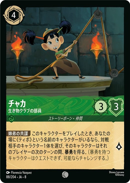 - 【姉弟の共謀】 このキャラクターをプレイしたとき、あなたの場に《ティポ》という名前のキャラクターがいるなら、対戦相手のキャラクター1体を選び、そのキャラクターはそれのプレイヤーの次のターンの間、暴勇を得る。(暴勇を持つキャラクターはクエストできず、可能ならチャレンジする。)