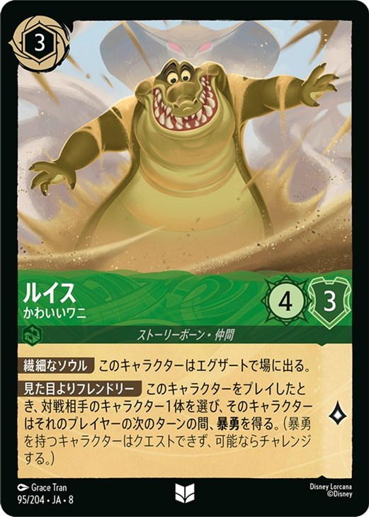 【見た目よりフレンドリー】 このキャラクターをプレイしたとき、対戦相手のキャラクター1体を選び、そのキャラクターはそれのプレイヤーの次のターンの間、暴勇を得る。(暴勇を持つキャラクターはクエストできず、可能ならチャレンジする。)