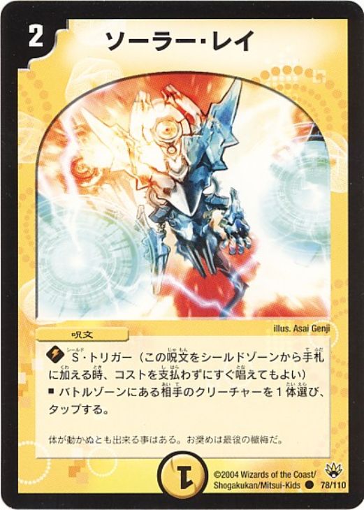 - S・トリガー(この呪文をシールドゾーンから手札に加える時、コストを支払わずにすぐ唱えてもよい) バトルゾーンにある相手のクリーチャーを1体選び、タップする。体が動かぬとも出来る事はある。お奨めは最後の懺悔だ。
