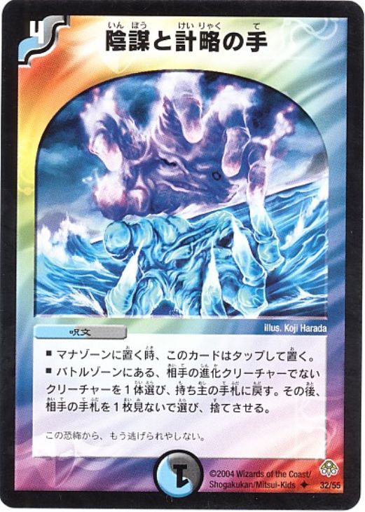 - マナゾーンに置く時、このカードはタップして置く。バトルゾーンにある、相手の進化クリーチャーでないクリーチャーを1体選び、持主の手札に戻す。その後、相手の手札を1枚見ないで選び、捨てさせる。この恐怖から、もう逃げられやしない。