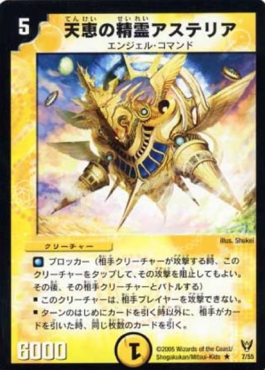 - ブロッカー(相手クリーチャーが攻撃する時、このクリーチャーをタップして、その攻撃を阻止してもよい。その後、その相手クリーチャーとバトルする)このクリーチャーは、相手プレイヤーを攻撃できない。ターンのはじめにカードを引く時以外に、相手がカードを引いた時、同じ枚数のカードを引く。-