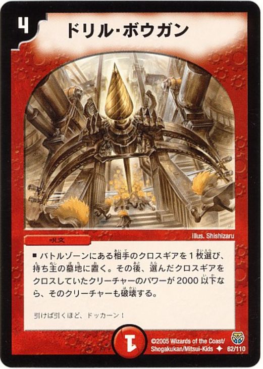 - バトルゾーンにある相手のクロスギアを1枚選び、持ち主の墓地に置く。その後、選んだクロスギアをクロスしていたクリーチャーのパワーが2000以下なら、そのクリーチャーも破壊する。引けば引くほど、ドッカーン!