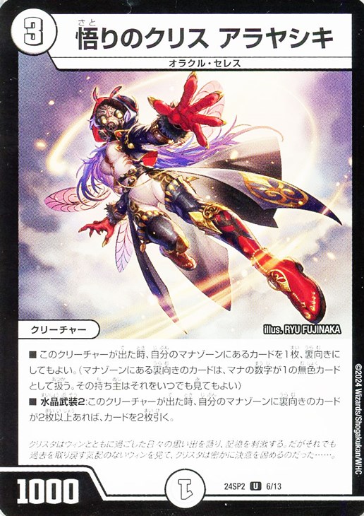 ■水晶武装2:このクリーチャーが出た時、自分のマナゾーンに裏向きのカードが2枚以上あれば、カードを2枚引く。