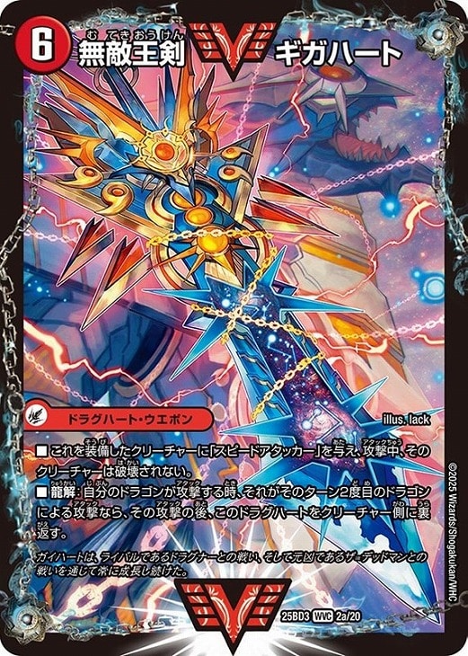 ■このクリーチャーが攻撃する時、または相手がこのクリーチャーを選んだ時、コスト10以下のドラグハート・クリーチャーを1体、自分の超次元ゾーンから出す。そのクリーチャーにそのターン、「スピードアタッカー」を与える。