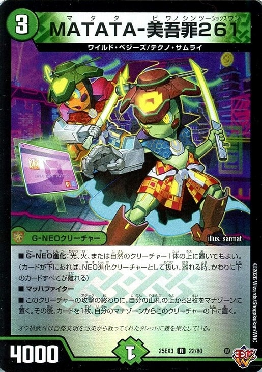 ■このクリーチャーの攻撃の終わりに、自分の山札の上から2枚をマナゾーンに置く。その後、カードを1枚、自分のマナゾーンからこのクリーチャーの下に置く。