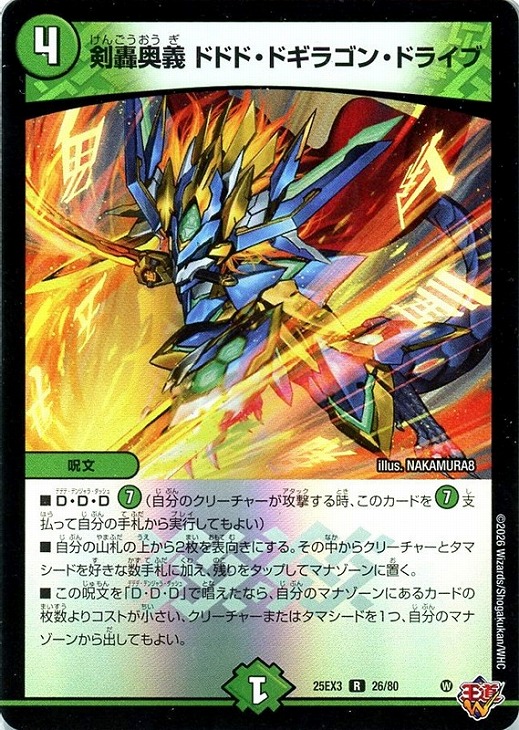 ■この呪文を「D・D・D」で唱えたなら、自分のマナゾーンにあるカードの枚数よりコストが小さい、クリーチャーまたはタマシードを1つ、自分のマナゾーンから出してもよい。