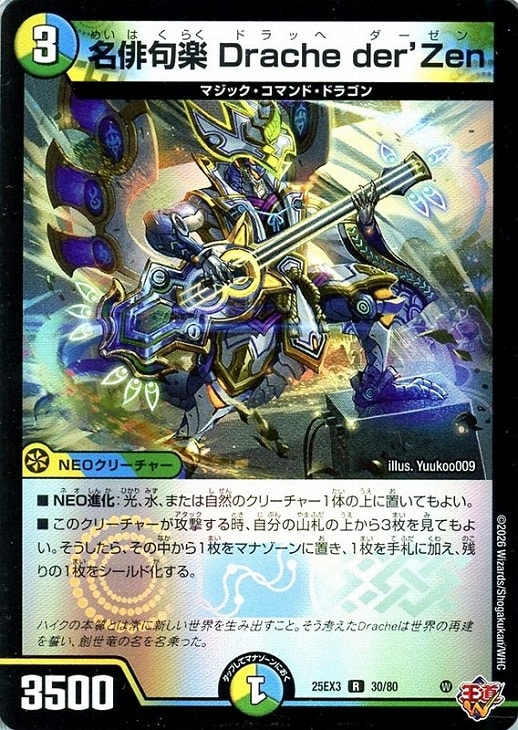 ■このクリーチャーが攻撃する時、自分の山札の上から3枚を見てもよい。そうしたら、その中から1枚をマナゾーンに置き、1枚を手札に加え、残りの1枚をシールド化する。