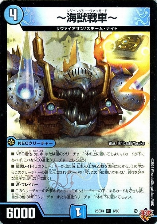 ■超魂レイド(このクリーチャーが出た時、山札の上から3枚を表向きにする。その中からこのクリーチャーの進化元になれるカードを1枚、この下に置いてもよい。残りを好きな順序で山札の下に置く)