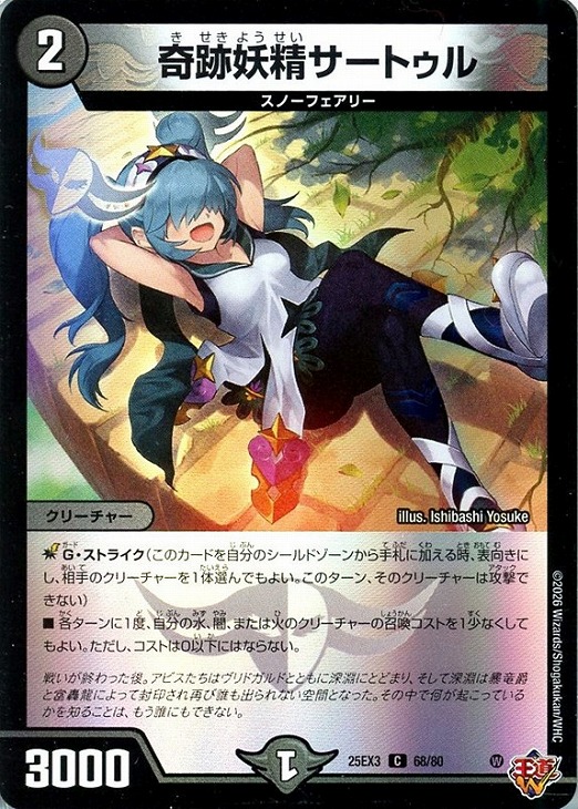 ■各ターンに一度、自分の水、闇、または火のクリーチャーの召喚コストを1少なくしてもよい。ただし、コストは0以下にはならない。