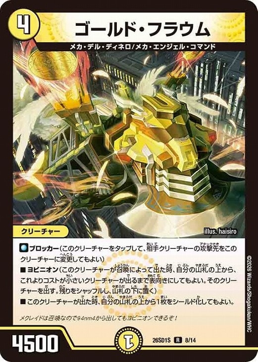 ■ヨビニオン(このクリーチャーが召喚によって出た時、自分の山札の上から、これよりコストが小さいクリーチャーが出るまで表向きにしてもよい。そのクリーチャーを出す。残りをシャッフルし、山札の下に置く)