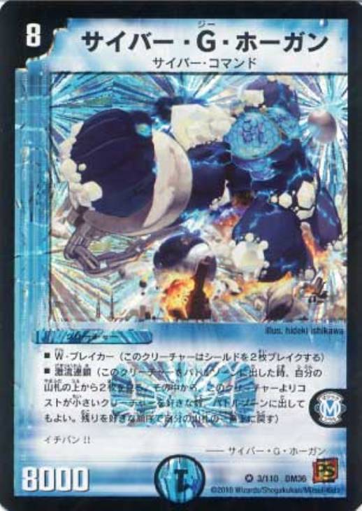 - W・ブレイカー(このクリーチャーはシールドを2枚ブレイクする)激流連鎖(このクリーチャーをバトルゾーンに出した時、自分の山札の上から2枚を見る。その中から、このクリーチャーよりコストが小さいクリーチャーを好きな数、バトルゾーンに出してもよい。残りを好きな順序で自分の山札の一番上に戻す)イチバン!! ―サイバー・G・ホーガン