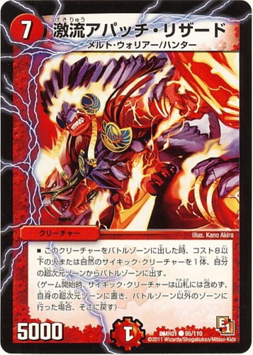 このクリーチャーをバトルゾーンに出した時、コスト8以下の火または自然のサイキック・クリーチャーを1体、自分の超次元ゾーンからバトルゾーンに出す。 (ゲーム開始時、サイキック・クリーチャーは山札には含めず、自身の超次元ゾーンに置き、バトルゾーン以外のゾーンに行った場合、そこに戻す)-