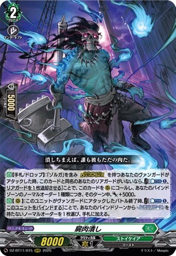 【自】【(R)】:このユニットがヴァンガードにアタックしたバトル終了時、【コスト】[【カウンターブラスト】(1),このユニットをバインドする]ことで、あなたのバインドゾーンから【レガリスピース】を持たないノーマルオーダーを1枚選び、手札に加える。