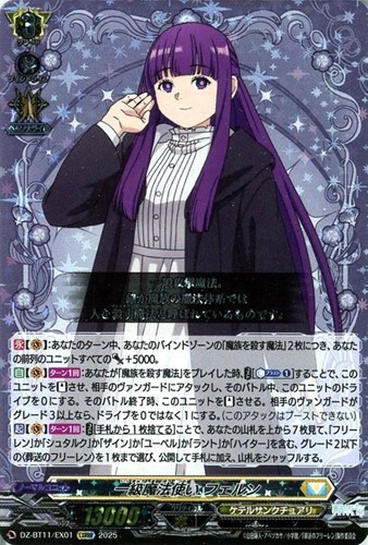 【自】【(V)】【ターン1回】:あなたが「魔族を殺す魔法」をプレイした時、【コスト】[【カウンターブラスト】(1)]することで、このユニットを【スタンド】させ、相手のヴァンガードにアタックし、そのバトル中、このユニットのドライブを0にする。そのバトル終了時、このユニットを【スタンド】させる。相手のヴァンガードがグレード3以上なら、ドライブを0ではなく1にする。(このアタックはブーストできない)