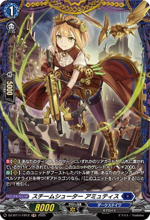 【自】【(R)】:このユニットがブーストしたバトル終了時、あなたのヴァンガードがペルソナライドを持つ〈ギアドラゴン〉なら、【コスト】[このユニットをバインドする]ことで、1枚引く。