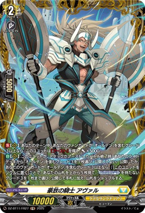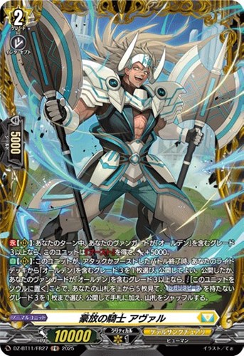 【自】【(R)】:このユニットが、アタックかブーストしたバトル終了時、あなたのライドデッキから「オールデン」を含むグレード3を1枚選び、公開してよい。公開したか、あなたのヴァンガードが「オールデン」を含むグレード3以上なら、【コスト】[このユニットをソウルに置く]ことで、あなたの山札を上から5枚見て、【レガリスピース】を持たないグレード3を1枚まで選び、公開して手札に加え、山札をシャッフルする。