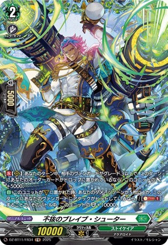 【自】:このユニットが(G)に置かれた時、あなたのダメージゾーンが5枚以上か、このターンにあなたのヴァンガードにアタックがヒットしているなら、【コスト】[【ソウルブラスト】(1)]することで、そのバトル中、このユニットのシールド+10000。