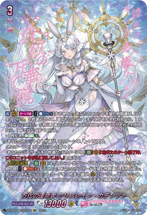 【ディヴァインスキル】-【自】【(V)】:このユニットがグレード3以上にアタックしたバトル終了時、【コスト】[【ソウルブラスト】(1)]することで、あなたのリアガードを望む枚数選び、手札に戻し、あなたの手札からユニットカードを1枚まで選び、(R)にコールし、そのターン中、そのユニットのパワーとクリティカルを、このユニットと同じになるまで増減させる。