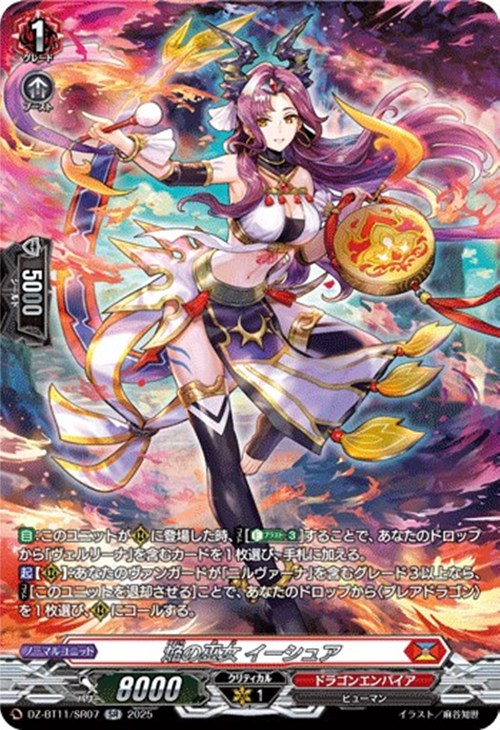 【起】【(R)】:あなたのヴァンガードが「ニルヴァーナ」を含むグレード3以上なら、【コスト】[このユニットを退却させる]ことで、あなたのドロップから〈プレアドラゴン〉を1枚選び、(R)にコールする。