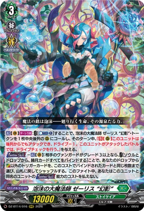 - 【起】【(V)】【ターン1回】:【コスト】[【カウンターブラスト】(1)]することで、泡沫の大魔法師 ゼーリス “幻影”・トークンを1枚中央後列の(R)にコールし、そのターン中、『【永】【(R)】このユニットは後列からでもアタックでき、ドライブ-1。このユニットがアタックしたバトルでは、ドライブチェックを行う。』を与える。