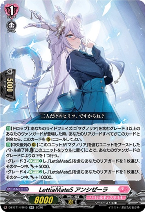 ・グレード3-【エネルギーチャージ】(1)し、「LettiaMateS」を含むあなたのリアガードを1枚選び、そのターン中、パワー+5000。