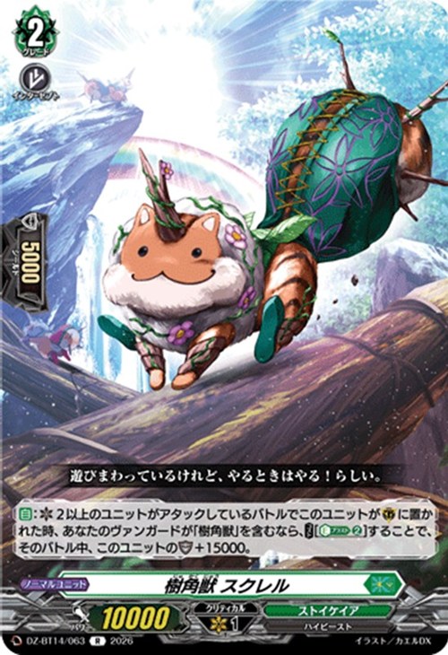 - 【自】:クリティカル2以上のユニットがアタックしているバトルでこのユニットが(G)に置かれた時、あなたのヴァンガードが「樹角獣」を含むなら、【コスト】[【エネルギーブラスト】(2)]することで、そのバトル中、このユニットのシールド+15000。