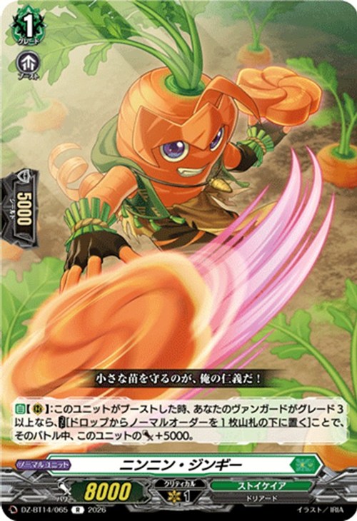 - 【自】【(R)】:このユニットがブーストした時、あなたのヴァンガードがグレード3以上なら、【コスト】[ドロップからノーマルオーダーを1枚山札の下に置く]ことで、そのバトル中、このユニットのパワー+5000。