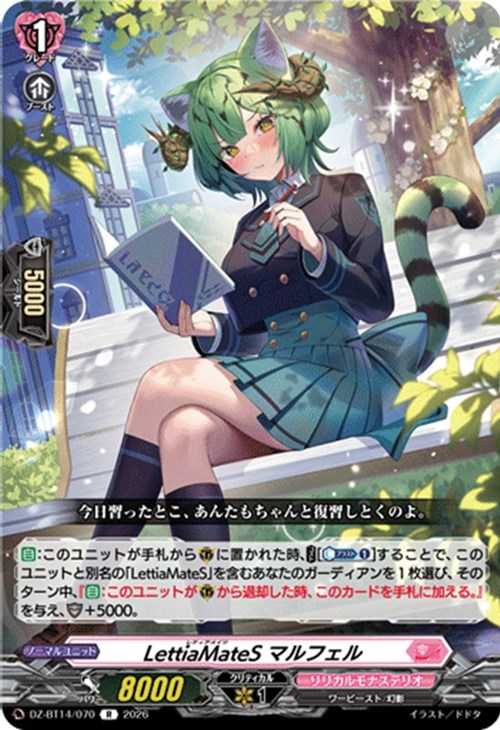 - 【自】:このユニットが手札から(G)に置かれた時、【コスト】[【カウンターブラスト】(1)]することで、このユニットと別名の「LettiaMateS」を含むあなたのガーディアンを1枚選び、そのターン中、『【自】:このユニットが(G)から退却した時、このカードを手札に加える。』を与え、シールド+5000。