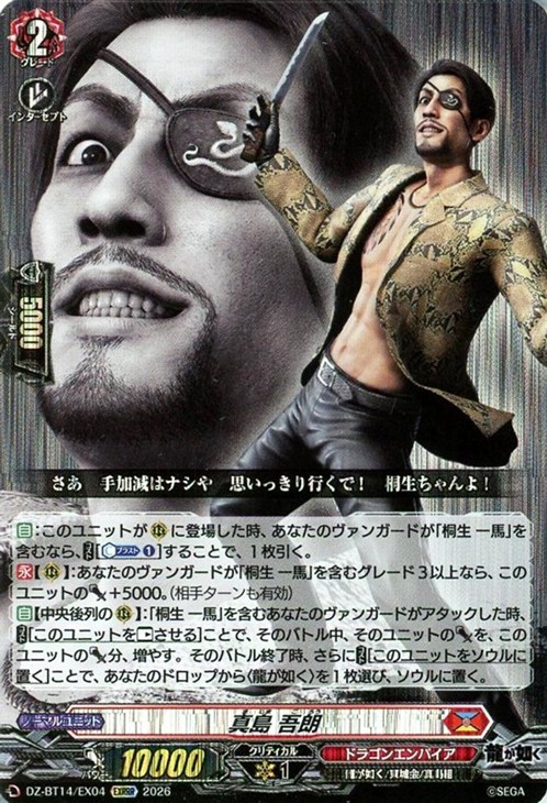 【自】【中央後列の(R)】:「桐生 一馬」を含むあなたのヴァンガードがアタックした時、【コスト】[このユニットを【レスト】させる]ことで、そのバトル中、そのユニットのパワーを、このユニットのパワー分、増やす。そのバトル終了時、さらに【コスト】[このユニットをソウルに置く]ことで、あなたのドロップから〈龍が如く〉を1枚選び、ソウルに置く。