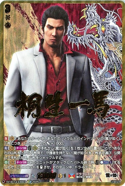 - 【永】【(V)】:あなたのターン中、あなたの、ソウルとバインドゾーンの〈龍が如く〉1枚につき、このユニットのパワー+1000。