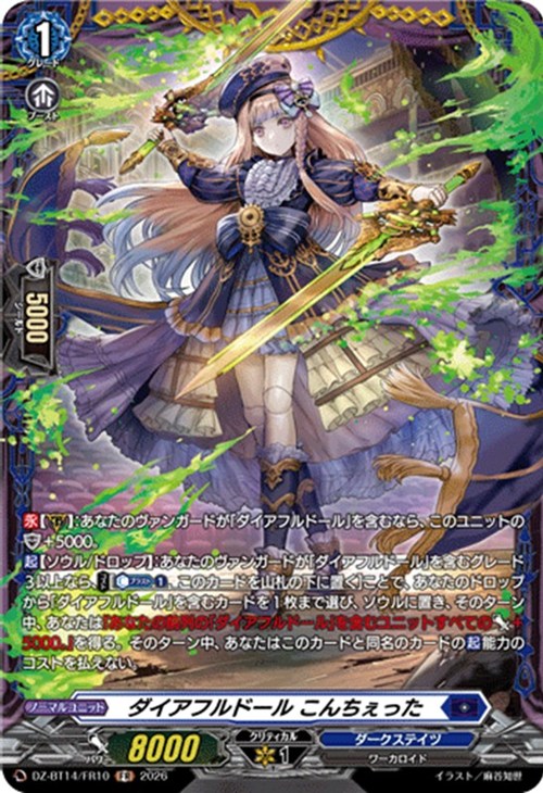 【起】【ソウル/ドロップ】:あなたのヴァンガードが「ダイアフルドール」を含むグレード3以上なら、【コスト】[【カウンターブラスト】(1),このカードを山札の下に置く]ことで、あなたのドロップから「ダイアフルドール」を含むカードを1枚まで選び、ソウルに置き、そのターン中、あなたは『あなたの前列の「ダイアフルドール」を含むユニットすべてのパワー+5000。』を得る。そのターン中、あなたはこのカードと同名のカードの【起】能力のコストを払えない。