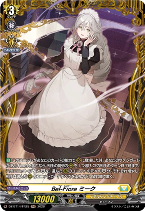 - 【自】:このユニットがあなたのカードの能力で(R)に登場した時、あなたのヴァンガードが「Bel-Fiore」を含むなら、相手の前列の(R)を1つ選び、次の相手のターン終了時まで、このユニットのパワーとシールドを、選んだ(R)のユニットの元々のシールド分、それぞれ増やし、相手は選んだ(R)のユニットカードすべてを山札の下に望む順で置く。