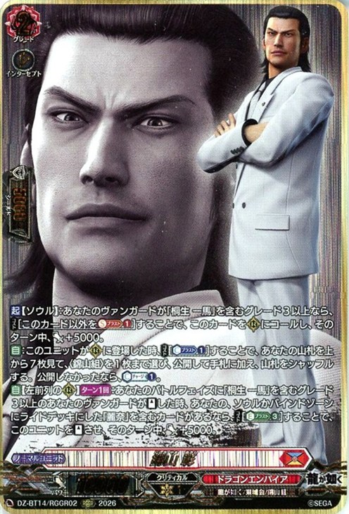 - 【起】【ソウル】:あなたのヴァンガードが「桐生 一馬」を含むグレード3以上なら、【コスト】[このカード以外を【ソウルブラスト】(1)]することで、このカードを(R)にコールし、そのターン中、パワー+5000。
