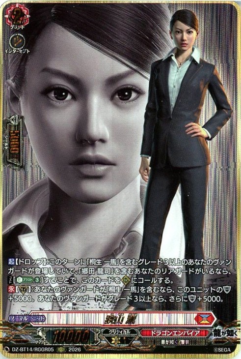 - 【起】【ドロップ】:このターンに「桐生 一馬」を含むグレード3以上のあなたのヴァンガードが登場していて、「郷田 龍司」を含むあなたのリアガードがいるなら、【コスト】[【エネルギーブラスト】(3)]することで、このカードを(R)にコールする。