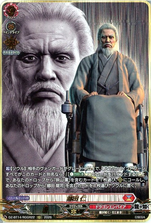 - 【起】【ソウル】:相手のヴァンガードがグレード3以上で、あなたのバインドゾーンすべてがこのカードと別名なら、【コスト】[【エネルギーブラスト】(3),このカードをバインドする]ことで、あなたのドロップから「狭山 薫」を含むカードを1枚選び、(R)にコールし、あなたのドロップから「郷田 龍司」を含むカードを1枚選び、ソウルに置く。