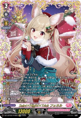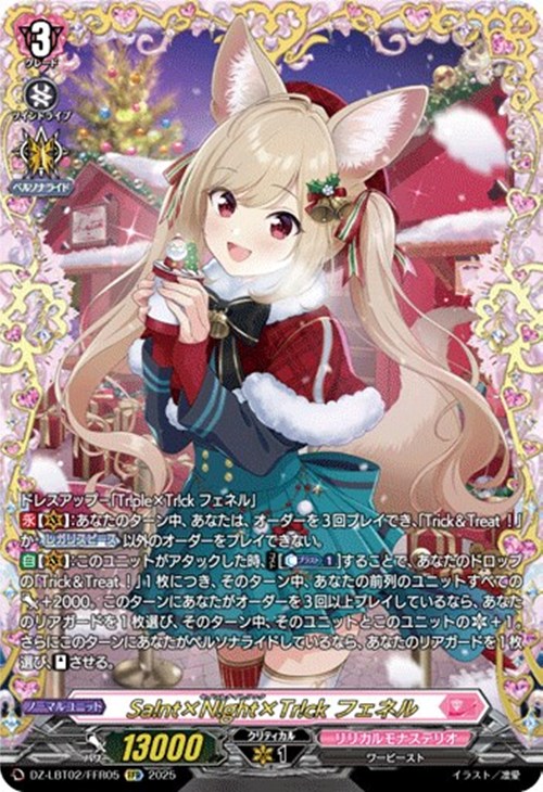 【自】【(V)】:このユニットがアタックした時、【コスト】[【カウンターブラスト】(1)]することで、あなたのドロップの「Trick&Treat!」1枚につき、そのターン中、あなたの前列のユニットすべてのパワー+2000。このターンにあなたがオーダーを3回以上プレイしているなら、あなたのリアガードを1枚選び、そのターン中、そのユニットとこのユニットのクリティカル+1。さらにこのターンにあなたがペルソナライドしているなら、あなたのリアガードを1枚選び、【スタンド】させる。