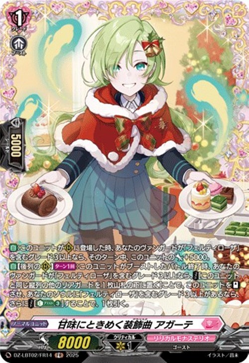 【自】【後列の(R)】【ターン1回】:このユニットがブーストしたバトル終了時、あなたのヴァンガードが「フェルティローザ」を含むグレード3以上なら、【コスト】[このユニットと同じ縦列の他のリアガードを1枚山札の下に置く]ことで、このユニットを【スタンド】させ、あなたのソウルに「フェルティローザ」を含むグレード3以上があるなら、さらに【コスト】[【エネルギーブラスト】(3)]することで、1枚引く。