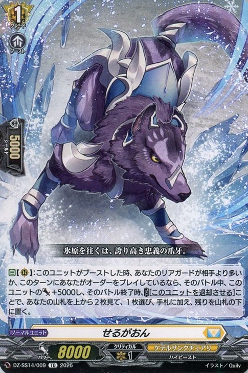 - 【自】【(R)】:このユニットがブーストした時、あなたのリアガードが相手より多いか、このターンにあなたがオーダーをプレイしているなら、そのバトル中、このユニットのパワー+5000し、そのバトル終了時、【コスト】[このユニットを退却させる]ことで、あなたの山札を上から2枚見て、1枚選び、手札に加え、残りを山札の下に置く。