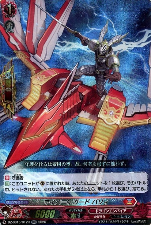 【自】:このユニットが(G)に置かれた時、あなたのユニットを1枚選び、そのバトル中、ヒットされない。あなたの手札が2枚以上なら、手札から1枚選び、捨てる。