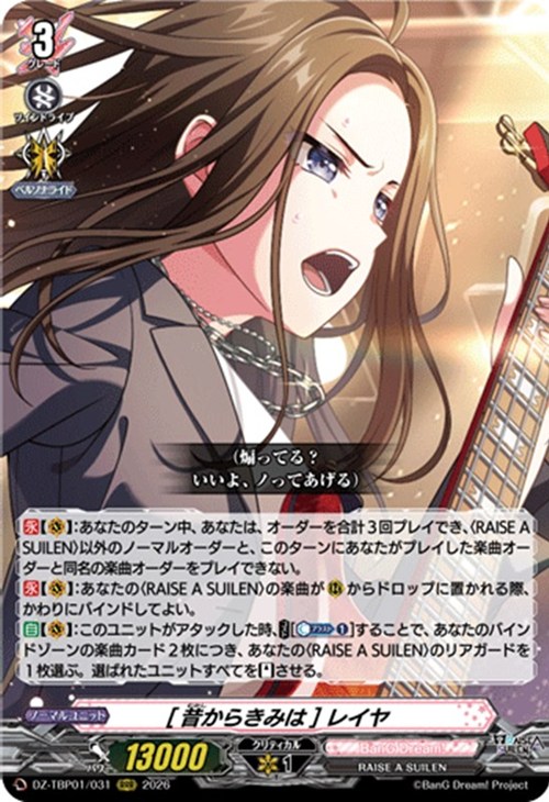 - 【永】【(V)】:あなたのターン中、あなたは、オーダーを合計3回プレイでき、〈RAISE A SUILEN〉以外のノーマルオーダーと、このターンにあなたがプレイした楽曲オーダーと同名の楽曲オーダーをプレイできない。