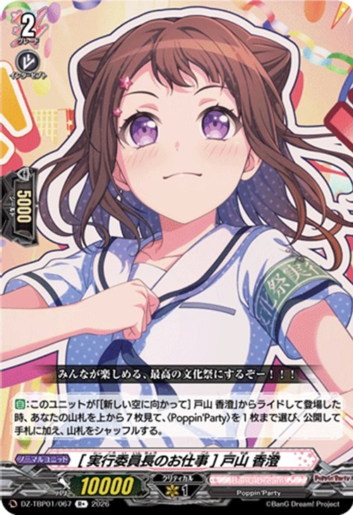 - 【自】:このユニットが「[新しい空に向かって] 戸山 香澄」からライドして登場した時、あなたの山札を上から7枚見て、〈Poppin'Party〉を1枚まで選び、公開して手札に加え、山札をシャッフルする。