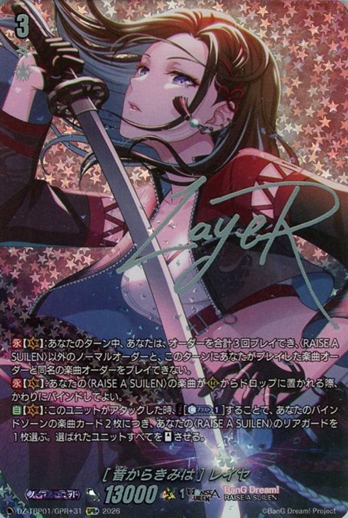 【永】【(V)】:あなたのターン中、あなたは、オーダーを合計3回プレイでき、〈RAISE A SUILEN〉以外のノーマルオーダーと、このターンにあなたがプレイした楽曲オーダーと同名の楽曲オーダーをプレイできない。 【永】【(V)】:あなたの〈RAISE A SUILEN〉の楽曲が(R)からドロップに置かれる際、かわりにバインドしてよい。 【自】【(V)】:このユニットがアタックした時、【コスト】[【カウンターブラスト】(1)]することで、あなたのバインドゾーンの楽曲カード2枚につき、あなたの〈RAISE A SUILEN〉のリアガードを1枚選ぶ。選ばれたユニットすべてを【スタンド】させる。
