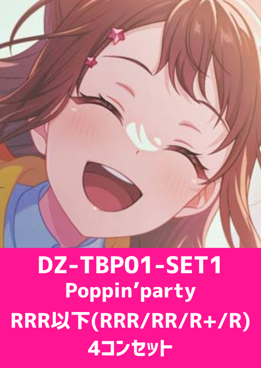 注)ブースターパックに収録されているPoppin'PartyのレアリティがRRR以下(RRR,RR,R+,R)のカードが各4枚入ったコンプリートセットです。無種族のカード(ミッシェルシール、超トリガー等)、パラレルカードは含まれません。