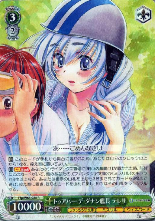 【自】【CXコンボ】 あなたのクライマックス置場に「戦いの幕開け」が置かれた時、前列にこのカードがいて、他のあなたの、《ファンタジア文庫》か《ミスリル》のキャラが4枚以上なら、あなたは相手の山札を上から3枚まで見てカードを3枚まで選び、控え室に置き、残りのカードを山札に戻し、相手はその山札をシャッフルする。