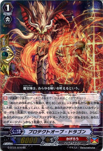 - 【永】:守護者(守護者はデッキに4枚までしか入れることができない) 【自】:[あなたの手札から1枚選び、捨てる] このユニットが手札から(G)に登場した時、コストを払ってよい。払ったら、あなたのアタックされているヴァンガードを1枚選び、そのバトル中、そのユニットは、ヒットされない。さらに、あなたのドロップゾーンに「プロテクトオーブ・ドラゴン」があるなら、あなたのダメージゾーンから1枚選び、表にする。