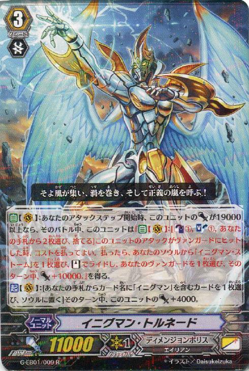 - 【自】【(V)】:あなたのアタックステップ開始時、このユニットのパワーが19000以上なら、そのバトル中、このユニットは『【自】【(V)】:[【カウンターブラスト】(1),【ソウルブラスト】(1),あなたの手札から2枚選び、捨てる] このユニットのアタックがヴァンガードにヒットした時、コストを払ってよい。払ったら、あなたのソウルから「イニグマン・ストーム」を1枚選び、【スタンド】でライドし、あなたのヴァンガードを1枚選び、そのターン中、パワー+10000。』を得る。 【起】【(V)】:[あなたの手札からカード名に「イニグマン」を含むカードを1枚選び、ソウルに置く] そのターン中、このユニットのパワー+4000。