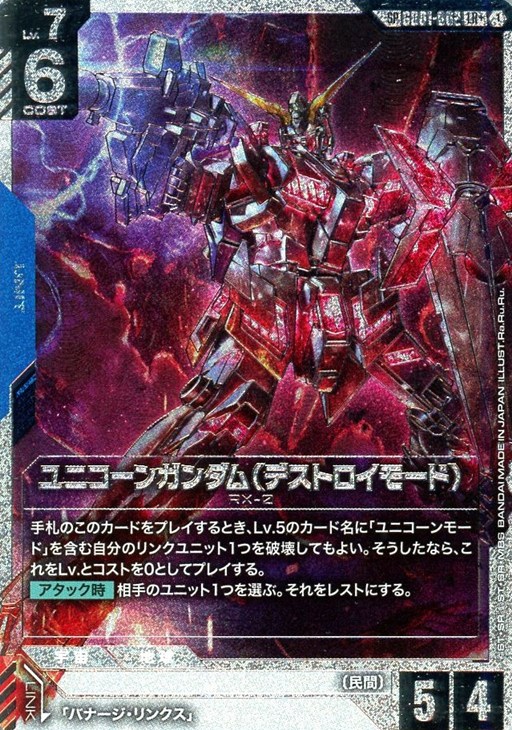 - 手札のこのカードをプレイするとき、Lv.5のカード名に「ユニコーンモード」を含む自分のリンクユニット1つを破壊してもよい。そうしたなら、これをLv.とコストを0としてプレイする。【アタック時】相手のユニット1つを選ぶ。それをレストにする。