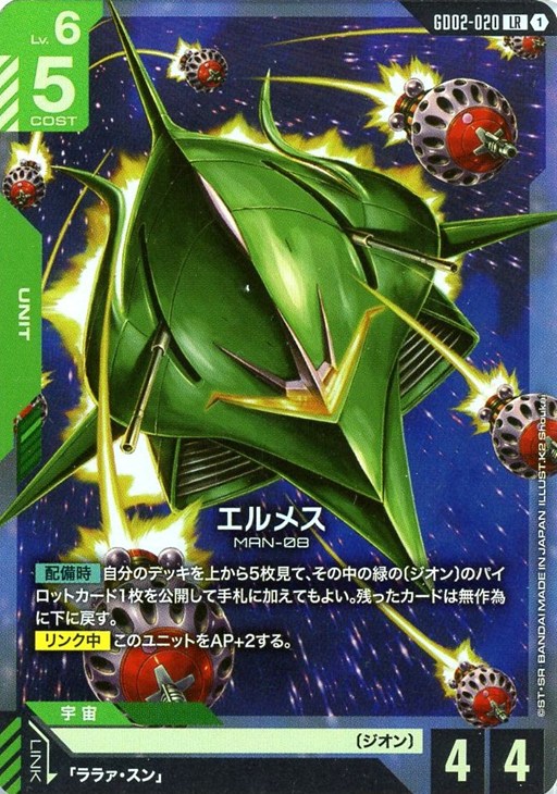 - 【配備時】自分のデッキを上から5枚見て、その中の緑の〔ジオン〕のパイロットカード1枚を公開して手札に加えてもよい。残ったカードは無作為に下に戻す。【リンク中】このユニットをAP+2する。