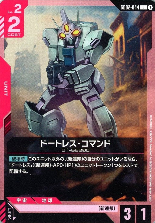 - 【破壊時】このユニット以外の、〔新連邦〕の自分のユニットがいるなら、「ドートレス」(〔新連邦〕・AP0・HP1)のユニットトークン1つをレストで配備する。